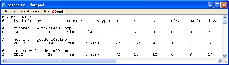Note that the first (non-comment) row in this file represents the character "CALEB". This character is the only one that starts out in your party at the beginning of a new game because the the field "party" is set to "1". We are going to change some characteristics of CALEB so as to increase his level by two so he becomes a level 3 character: