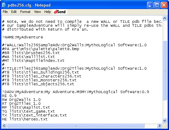 3) Edit configuration files.Edit each of the three configuration files for your new adventure using a text editor. The three configuration files are "pdbs4.cfg", "pdbs16.cfg", and "pdbs256.cfg" -- one for each of the three possible data sets that may be created for your new adventure: 4 gray, 16 gray, and 256 color. Because each optional version of your adventure will use a different set of graphics, each version requires its own configuration file to tell DB2ACK where to find the files required to build that version.