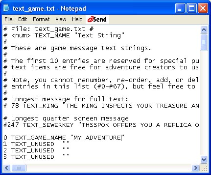 One of the files under your MyAdventure directory contains a big list of text strings that are used in the adventure. If you open the file DB2ACK/Adventures/MyAdventure/lists/text_game.txt in a text editor, you should see one of the first text strings in that list is "SAMPLE ADVENTURE". Change this to read "MY ADVENTURE". Note that by convention, we always use capital letters for text in the game because the Dragon Bane II font looks much better with all capital letters. Be careful not to change anything else in the file before saving your change.