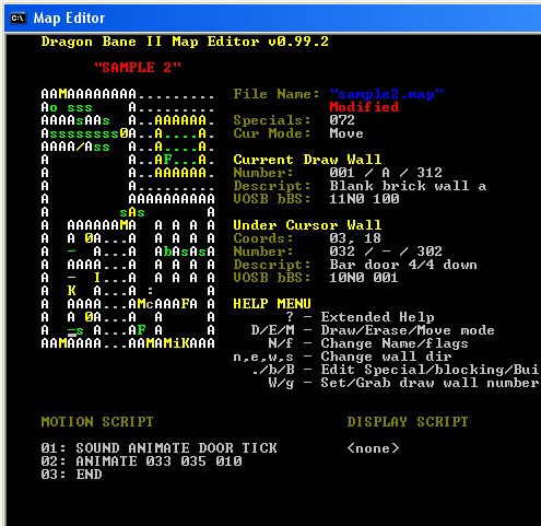 At this point, we have created a force field wall, now it is time to add instructions to that wall to teleport the party. But first, it is necessary to learn a few simple instructions for editing mapspecial code. Don't do it just yet, but to edit a MOTION SCRIPT or DISPLAY SCRIPT for the wall under your cursor, you will press the period key, '.'. This will open a new window and places your cursor at the first line of the MOTION SCRIPT. In this script editor, the following keys may be used: