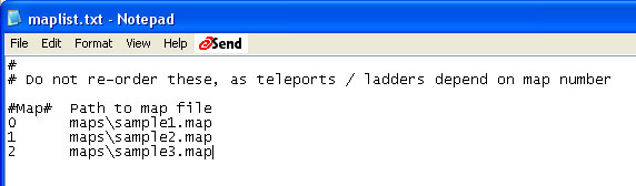 5) Add your new map to the "My Adventure" map list.In order for your new map file, sample3.map to be included in "My Adventure", you need to add that file to the maplist.txt file in your DB2ACK/Adventures/MyAdventure/lists directory. Open that maplist.txt file in a text editor, scroll to the bottom, and add the following line: