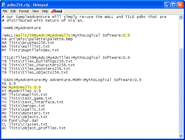 In this step, we are simply going to change the name of this walls database file to "Walls256MyAdv.pdb" (likewise for Walls4MyAdv.pdb, Walls16MyAdv.pdb). We are also changing the database's name to "MyAdvWalls" in the !WALL section and changing the wall data file referenced by the MyAdventure section to the new "MyAdvWalls" database name. For each of the three pdb config files in the DB2ACK/Adventures/MyAdventure, make edits as per Figure 38, below.