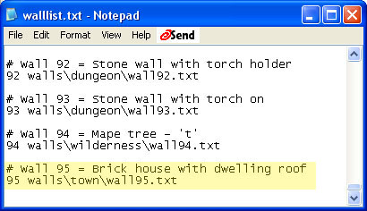 Open the file DB2ACK/Adventures/MyAdventure/lists/walllist.txt. This file contains a list of all the individual wall description files that are compiled into the walls database by mkpdbs. The data format is simple. Each non-comment line represents a wall ID and a path to it's wall description file.